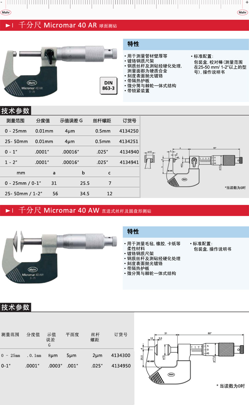 德國馬爾Mahr40AW千分尺量程0-1"mm直進式絲桿圓盤測砧4134950規(guī)格參數(shù)Specs